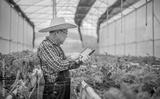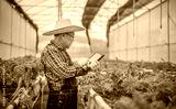 Farmer and Owner fresh organic vegetable in hydroponic smart farms under checking farm business laptop and smart phone on hand green harvest agriculture with business, healthy clean food