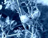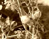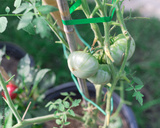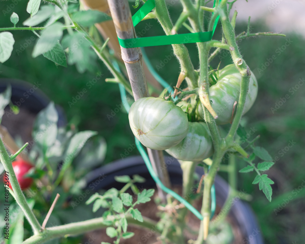 Large group of green tomatoes on vine with stretch ties and bamboo stake growing plants in container at backyard garden near Dallas, Texas