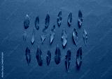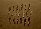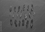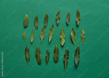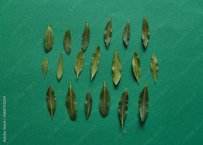 Curry leaf arranged in rows to form a pattern on a green background. Top view