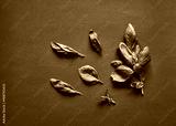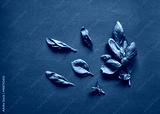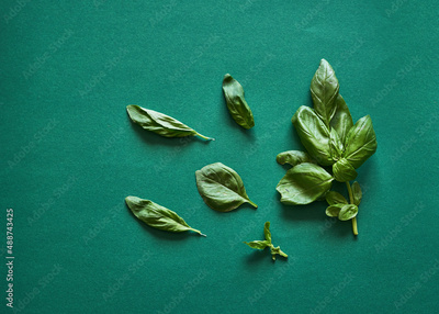 Fresh sprig of basil and its leaves on a green background. Top view, flat lay