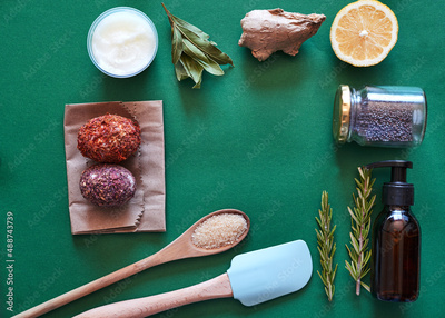 Homemade aromatherapy bath and spa products on a green background. Flat lay