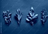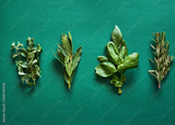A row of fresh sprigs of herbs on a green background. Top view, flat lay