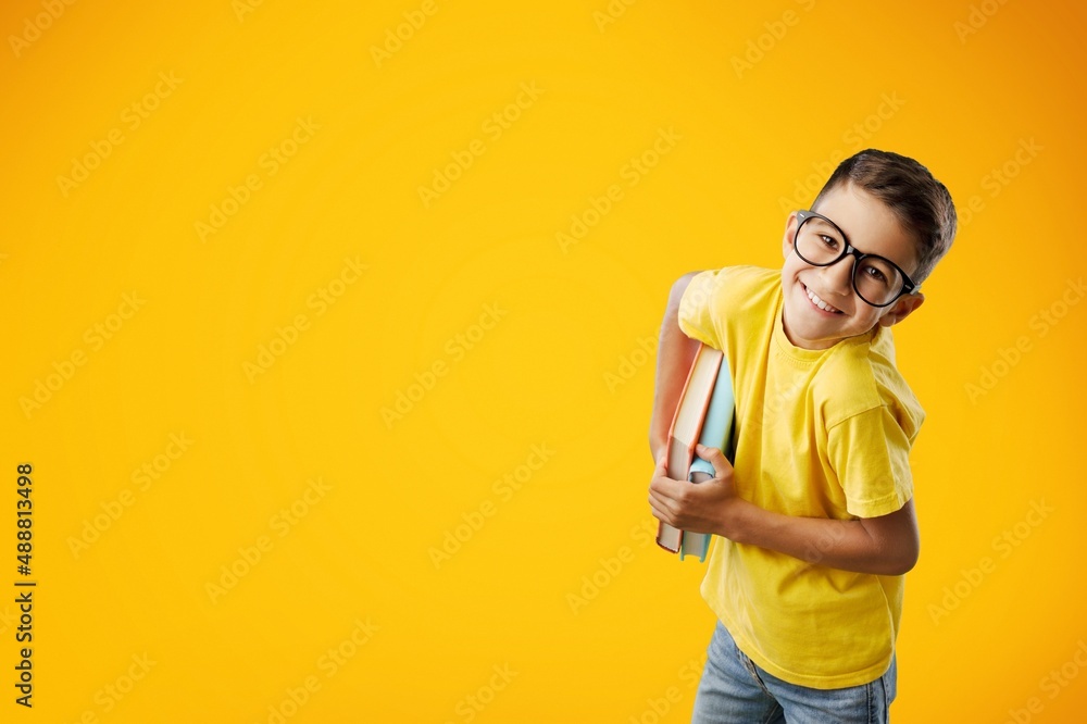 Happy school boy wearing glasses, holding backpack going to school, enjoying studying,