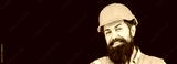 Man builders, industry. Builder in hard hat, foreman or repairman in the helmet. Portrait of a builder smiling. Bearded man worker with beard in building helmet or hard hat. Copy space