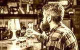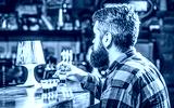 Drinking alcohol into shot glasses in a nightclub or bar. Bearded man shots cocktail. Tequila shots, vodka,whisky, rum. Barman in pub. Tequila shot. Colorful cocktails at the bar