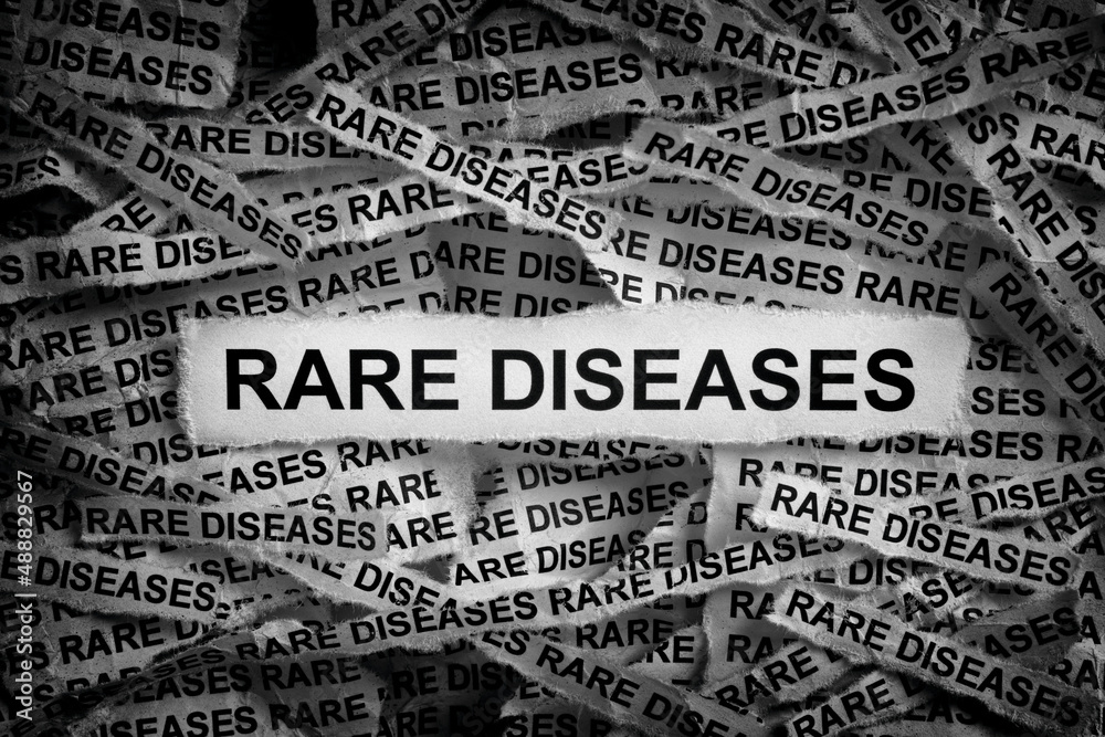 Strips of newspaper with the words Rare Diseases. Black and white. Close up.