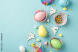 Top view photo of easter decor composition funny easter bunnies multicolored easter eggs in paper baking molds and confectionery topping on isolated pastel blue background with blank space
