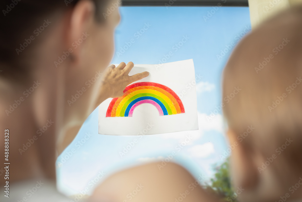 Happy life, and new beginnings concept. Mother and child holding up drawn rainbow tot the sky.