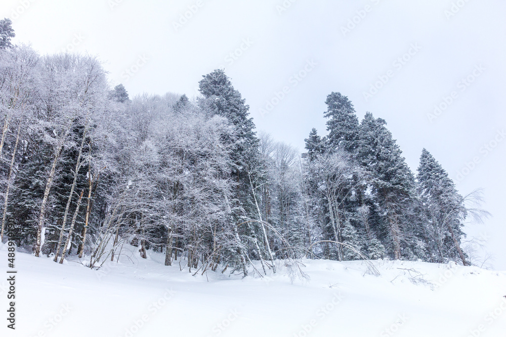 Winter morning sunrise in the mountains panoramic view from the site located on the ridge of the tourist route.+