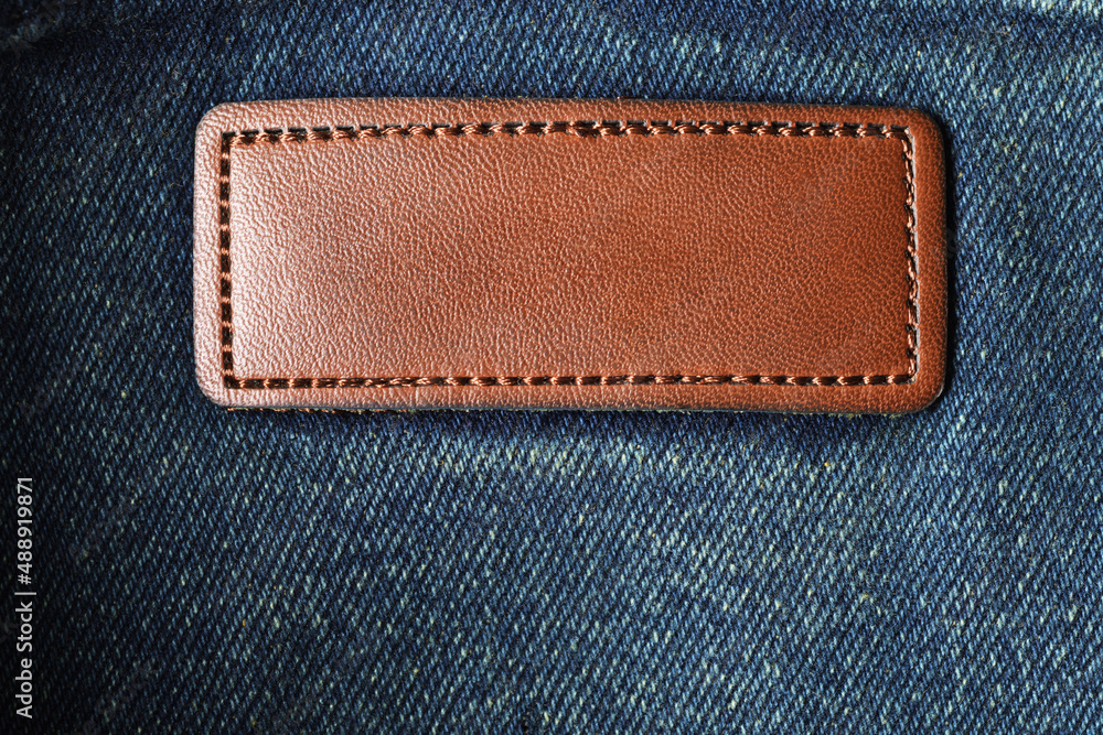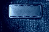Blank leather tag on the dark jeans cloth.