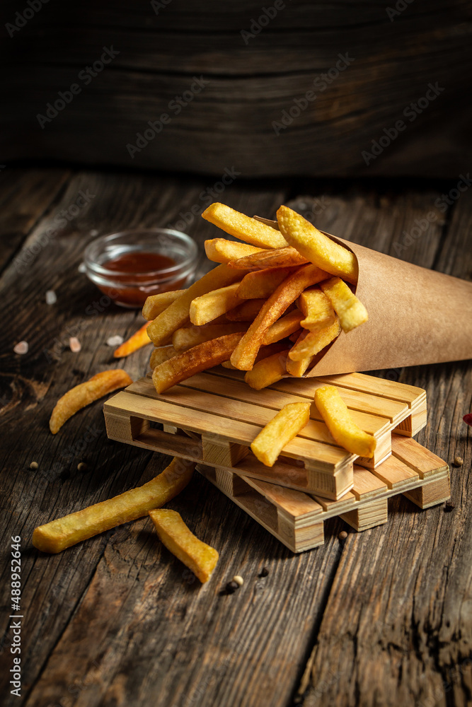 fries in paper box on wooden table. American food concept. fast food meal. banner, menu, recipe, place for text