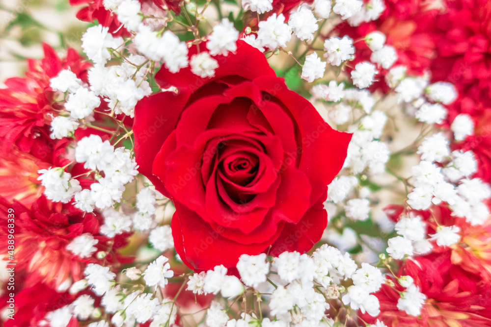 Blossoming bud of a red rose close-up in the center of a white flower arrangement