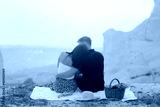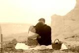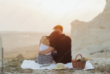 Romantic couple hugging while having picnic in the mountain. Young couple sitting back to camera on picnic blanket and man tender hugging his woman.