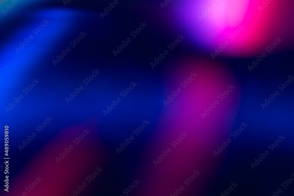 Blur color flare. Neon glow background. Bokeh radiance reflection. Defocused fluorescent blue pink light gleam on dark abstract overlay.