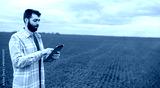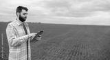 Farmer on a green wheat field with a tablet in his hands. Smart farm. Farmer checking his crops on an agricultural field. Ripening ears of wheat field. The concept of the agricultural business.