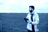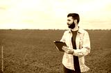 Farmer on a green wheat field with a tablet in his hands. Smart farm. Farmer checking his crops on an agricultural field. Ripening ears of wheat field. The concept of the agricultural business.