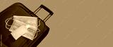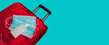 Medical face masks and antiseptic on a red suitcase, safe travel after the pandemic. Coronavirus free worldwide traveling, new normal lifestyle concept. flat lay, top view, banner, blue background