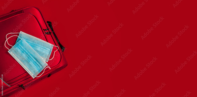 Medical face masks on a red suitcase, safe travel after the pandemic. Coronavirus free worldwide traveling, new normal lifestyle concept. flat lay, top view, banner, red background