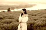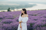Beautiful and pretty young woman in a white tender dress enjoys a walk in the lavender field with river on the background.