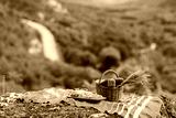 Summer picnic outdoors with basket with baguette and flowers, wooden plate with croissants, strawberry, bottle and glasses of wine. Romantic picnic with mountain view at sunny summer day.