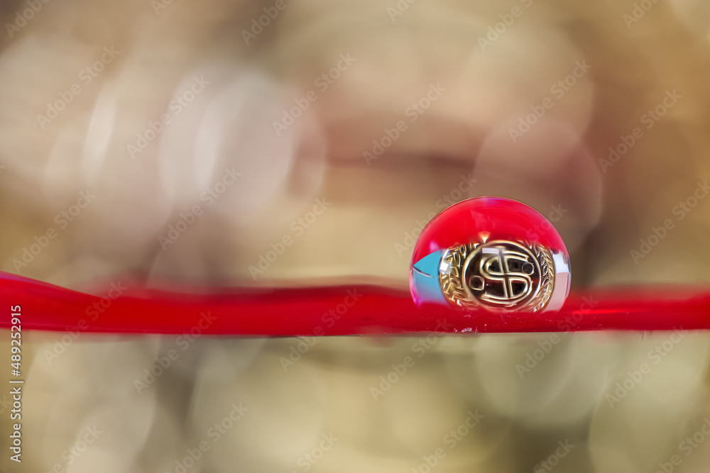 Close up shot of single water droplet on red feather with golden dollar symbol refraction inside .