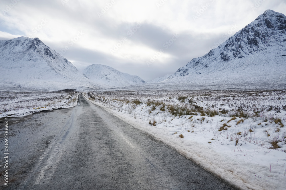 Buachaille Etive Mor mountain and empty road covered in snow during winter
