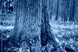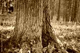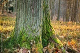 Drzewa w lesie w słoneczny dzień o poranku i wschodzi słońca
