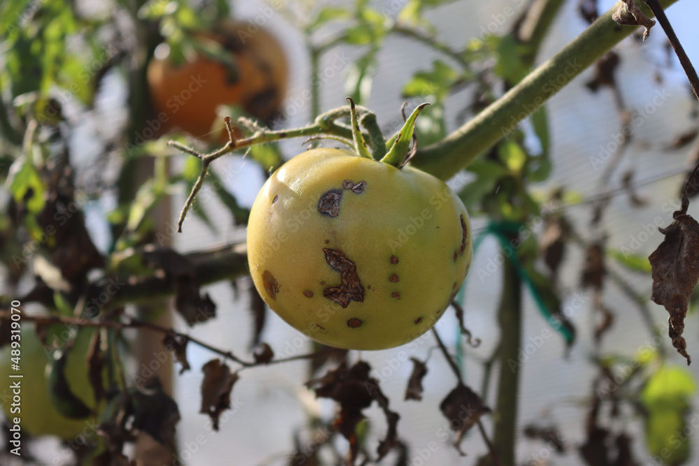 Rotten unripe tomatoes on plant in the vegetable garden. Tomato plants with disease