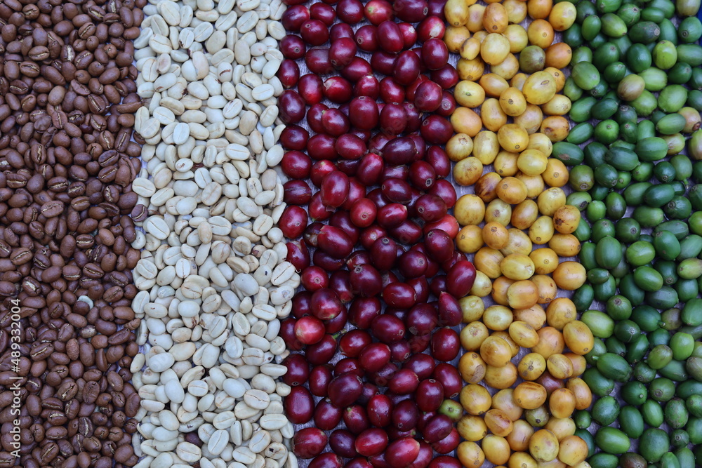 Mix of coffee beans and coffee tree blossom for background.Robusta and arabica coffee berries by agriculturist hands,Worker Harvest arabica coffee berries on its branch, harvest concept.