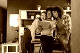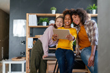 Group of teenage friend girls are using gadgets, talking and smiling together.