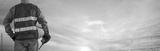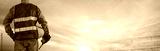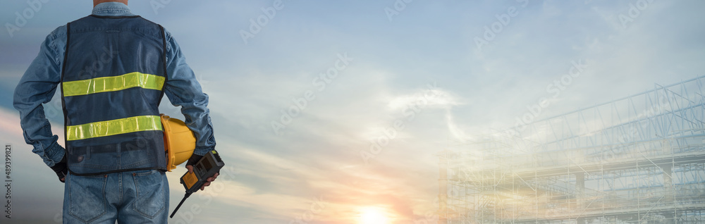 Banner worker engineer entrepreneur constrcution industry worker. Panoramic man engineer working hand holding walkie talkie manufacturing.engineering construction hardhat safety helmet structure