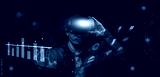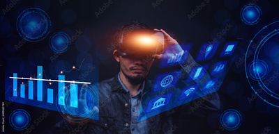Businessman on visual screen 3D data application technology and VR glasses on metaverse AI control