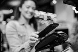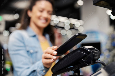 Close up of a woman paying bill on pos terminal with her phone at supermarket.