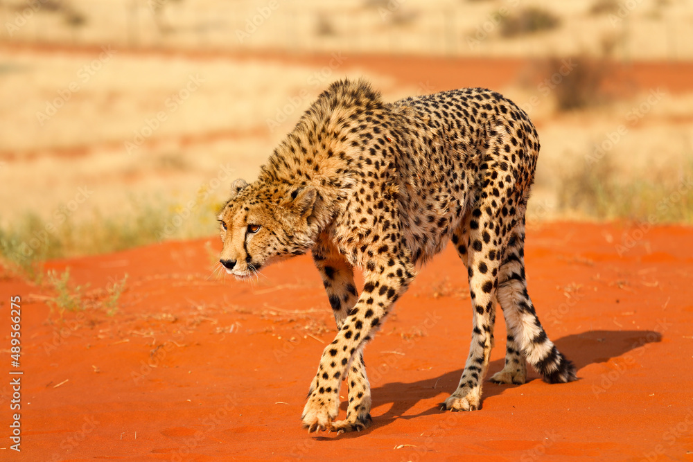 Leopard walks on the sand in the Kalahari Desert. Namibia.