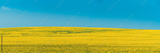 Rural Landscape With Blossom Of Canola Colza Yellow Flowers. Rapeseed, Oilseed Field Meadow. Panorama