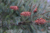 Pine cones on green pine branches.