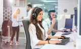Young positive woman customer support phone operator in microphone headset working on computer in the office