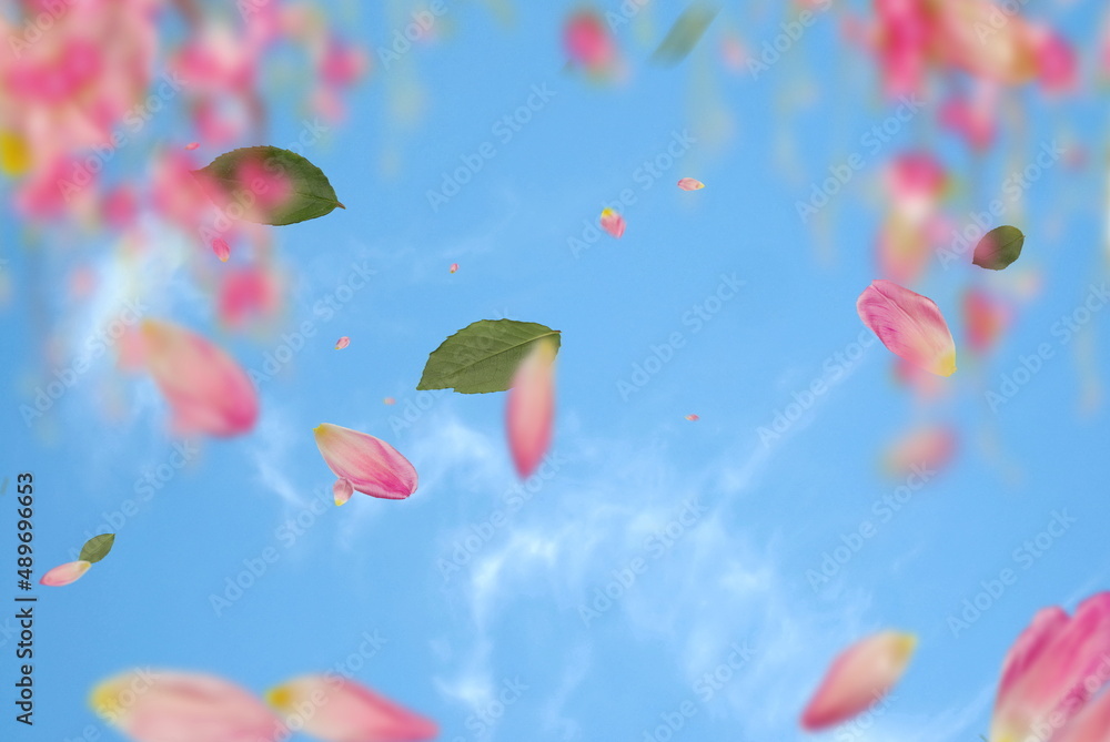 blue sky pink green flowers and leaves petal floral festive summer template backgrpundf greerting s card copy space