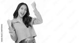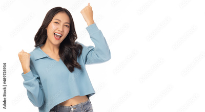 Excited young asian female with raised hands celebrating success Portrait cheerful positive asian woman with raised hands and fists open mouth Girl get happy, enjoy life isolated on white copy space