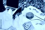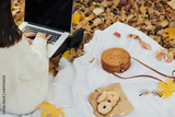 Woman using laptop for online work, browsing web at city park in autumn at picnic. Freelance career.