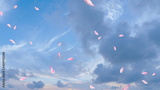 flying pink heart flowers petal on blue sky summer romantic festive background template copy space