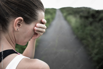 portrait of a tired woman facing a up hill road. Life difficulties, and problems concept