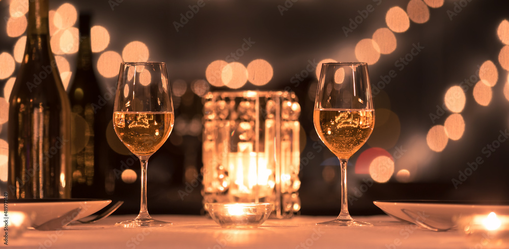 Wine glasses in a fine dinning restaurant candle light dinner romantic setting