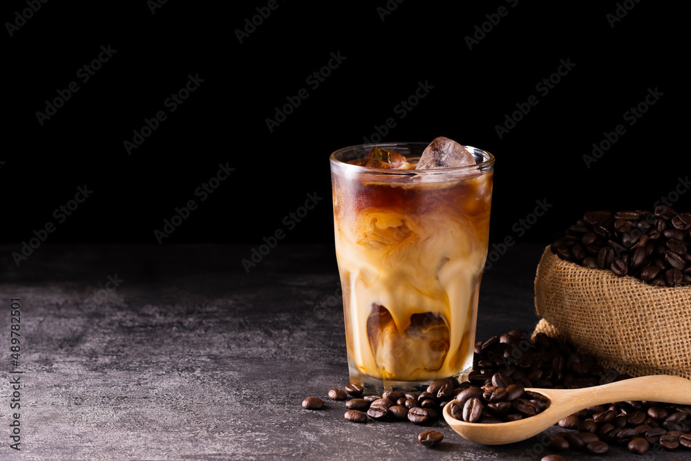 Coffee, iced latte in a glass Add milk or cream along with roasted coffee beans. Set on a wooden table at a coffee shop on a dark black background.