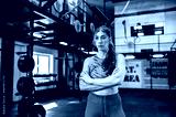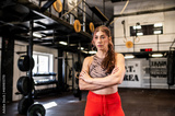 Attractive young masculine fitness girl posing in the new modern gym preparing for a full-body workout. Beautiful woman wearing sportswear. Healthy lifestyle concept.