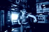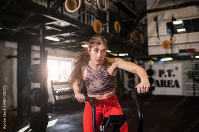 Attractive masculine young woman training on the bike in the modern interior gym testing her new gym equipment wearing sportswear. Fitness girl on her leg day in the sports center. Healthy lifestyle