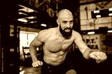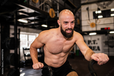 Young attractive shirtless bodybuilder exercising in the modern gym during his leg day on a bike. Hansome man training in a fitness center. Healthy lifestyle concept.