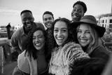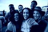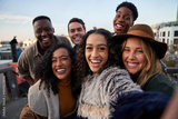 Multi-cultural group of friends taking a selfie at a rooftop party. Close up, smiles with diverse young adults.