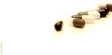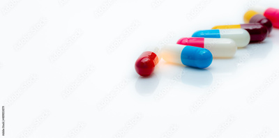 Selective focus on antibiotic capsule pills on white background. Pharmacy horizontal web banner. Prescription drugs. Antibiotic drug resistance. Capsule pill industry. Antibiotic drug selection.