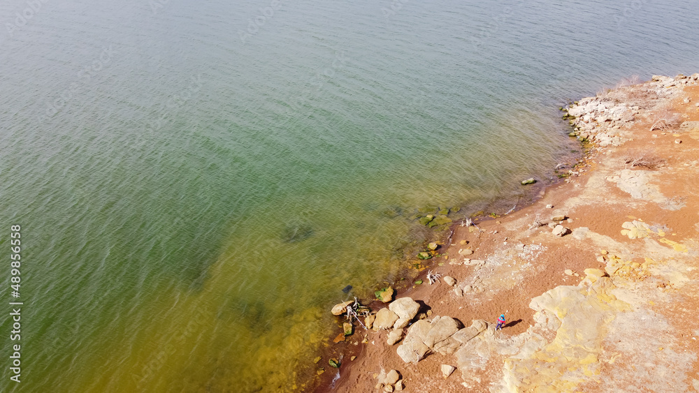 Aerial view unidentified kid wears jacket and shoes running near rocky shoreline at Grapevine Lake, Texas, America